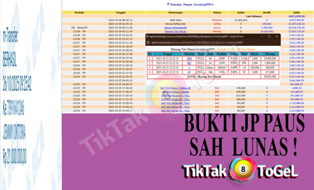 Bukti JP Paus User Kwxxxxx Pada Pasaran Toto Macau 26 Oktober 2025